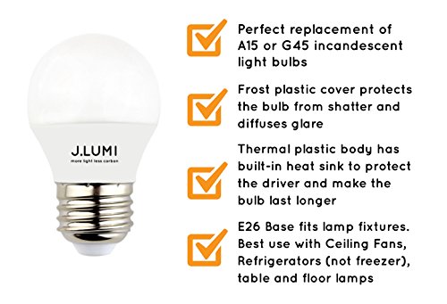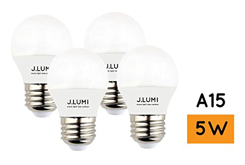 J.LUMI LED light bulb 5W, replaces 40W incandescent, A15 or G45 bulb shape, E26 medium base, warm white 3000K, Not Dimmable, 4 Pack