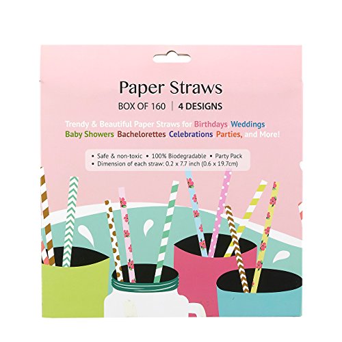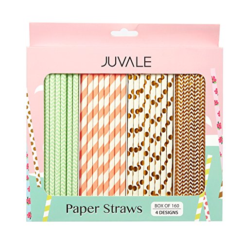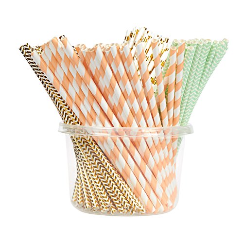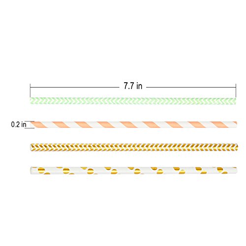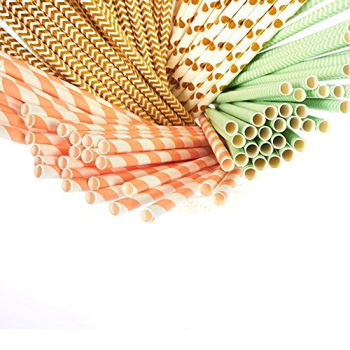 Paper Straws - 160-Pack Mint Green, Peach, and Gold Colored Fun Biodegradable Drinking Straws with Coral Stripes, Polka Dot, and Chevron Designs