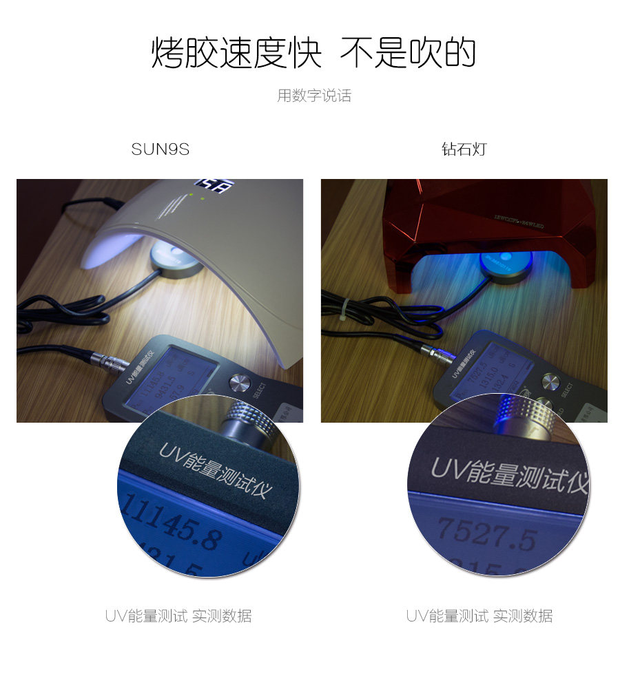 9S socket + USB version 24W (15 beads), infrared sensor, LCD display, can display the number of seconds baked plastic, socket + USB interface, can be used Po charging power supply (please charge more than 5V2A Po). Very convenient to go out or stall use.