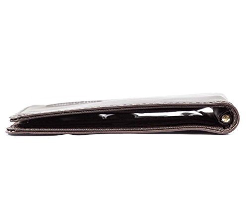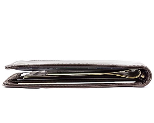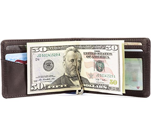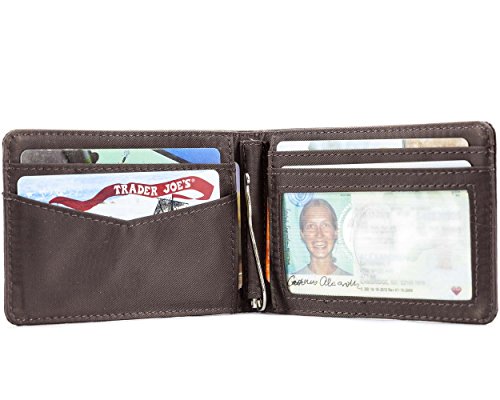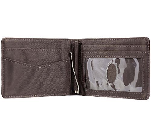 - Feature : Ultra-thin bi-fold wallet with spring-loaded metal money clip in the center; holds 20 plastic cards / ID pocket with a clear window, two credit card pocket and two extra-deep interior storage pocket / Extra-wide pocket with rubbery coating prevents cards from sliding out / Constructed of top grain cowhide leather with nylon microfiber interior / Measures 4-1/16 x 3 Inch