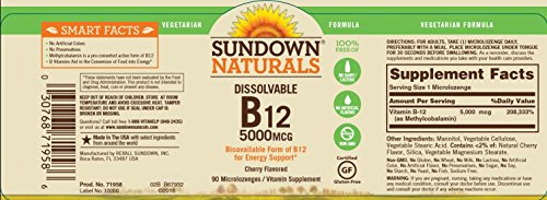 Sundown Naturals Quick Dissolve Methylcobalamin B12 is an easy way to get a high-potency source of this essential B Vitamin - simply place this delicious cherry-flavored microlozenge under your tongue for 30 seconds before swallowing. An ideal choice for those who have difficulty swallowing tablets and capsules, these sublingual microlozenges supply you with Vitamin B12 to support nervous system health and energy metabolism.* B12 also supports heart and circulatory health, and helps provide nourishment for the occasional stress of daily living.*Feature