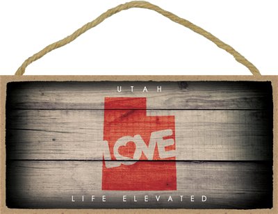 (SJT13577) Utah - State Outline With "Love" And State Motto 5" x 10" Wood Plaque Sign