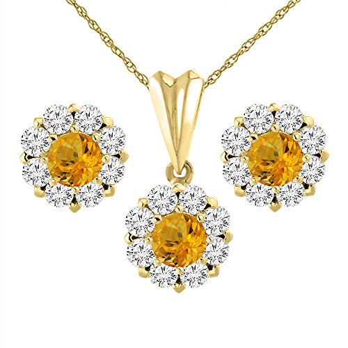 -. Title : 14K Yellow Gold Natural Citrine Earrings and Pendant Set with Diamond Halo Round 6 mm