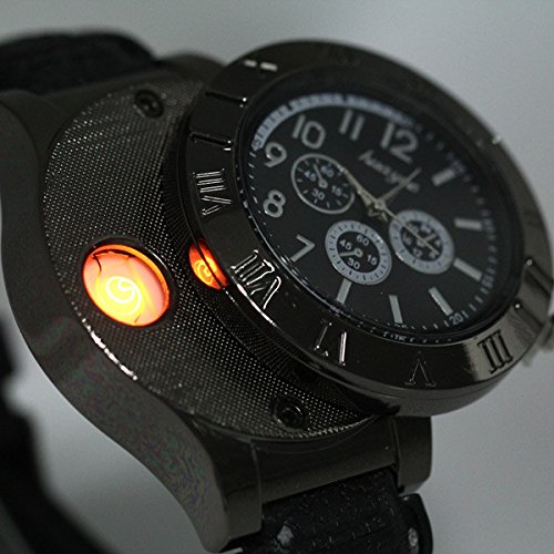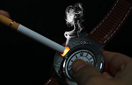 What a strange but useful wristwatch! Having this watch means you can empty out your pockets and leave that lighter at home, as one lighter is built into the watch. More surprising: It is an environmentally friendly electronic lighter and quartz watch, without gas, but charges through USB. Main Features: As a watch: • Built-in quartz movement for accurate time keeping