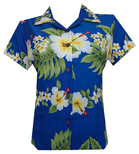 Hawaiian Shirts10A Women Hibiscus Flower Aloha Beach Top Blouse Casual Blue L