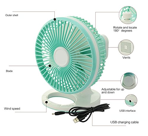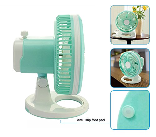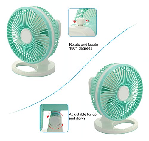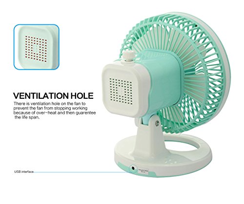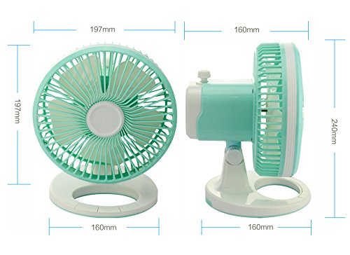 Specifications: 1. Type: USB table fan 2. Material: ABS & pp 3. Blade: 5 4. Fan blade diameter: 165mm 5. Dimensions: 29.5 x 16.5 x 22 cm 6. Switch: Piano type key 7. Net weight: 680 8. Modes: 2 10. Output voltage: DC 5v-8.2v 11. Output current: 210 ma -640 ma 12. Power: 8.8 w 13. Rotate speed: 1100-1500rpm 14. Power supply: Usb cautions: 1. Please put product in the place where children can not touch. 2. Please do not disassemble or refit product on your own. 3. Wet hands do not touch product when it is running. 4. Please do not use water to wash product, you can clean it by made scent cloth but make sure it is completely dry before using. 5. Do not infunde or insert metal, liquid or other stuff into product. 6. Do not deadlock the blades for a long time when product is running. 7. Do not put heavy stuff on product or its power cord and do not pull power cord forcefully. Package includes: 1 x 8 inch oscillating table fan. 1 x USB charge cable exclusively sold by e-joy. If the fan you received was different from the picture or logo, don't hesitate to report to Amazon. Pitch angle can be adjusted upwards or downwards.Feature