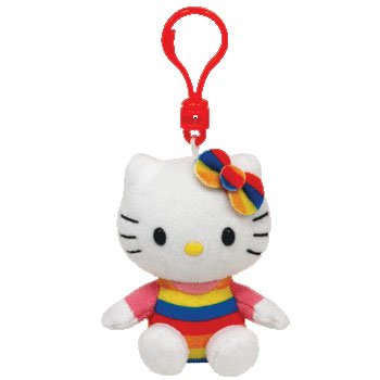 Say hello to this cute and cuddly kitty. This cute cat wears rainbow colored overalls. Hello Kitty keeps keys safe.