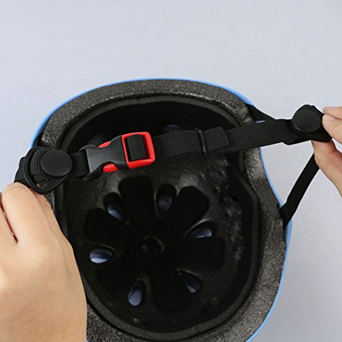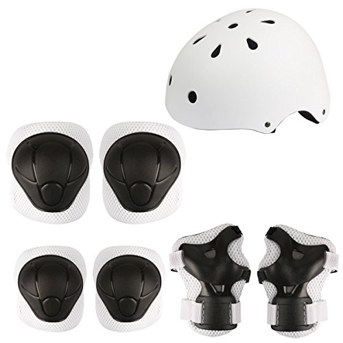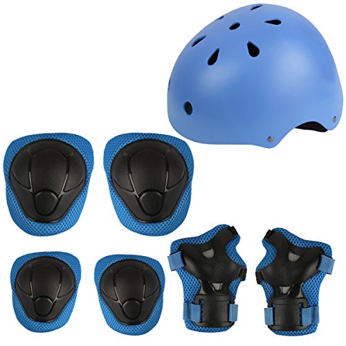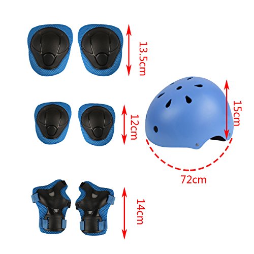 -. Feature : Suitable for: 4-14 years old kids Wrist guard, knee pads and elbow pads helmet included. / High hardness shell, thickened soft sponge, comfortable and durable. / Elbow, knee, wrist and head 7pcs a set, bring you all-round and perfect protection. / Multiple adjustable elastic straps and Velcro closures for secure fit for various knee girths. / ApproP.R.Iate for inline skating /roller skating/skateboard /riding bikes/ scooters roller blading/ riding a scooter and other extreme sports