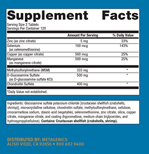 -. Binding : Health and Beauty -. Brand : Metagenics -. Color : default -. EAN : 0755571912459 -. Feature : Advanced joint support and protection* / Provides high quality glucosamine sulfate and chondroitin sulfate, nutritional factors known to support cartilage health and soft tissue formation / This product is non-GMO and gluten-free -. IsAdultProduct : 0 -. Label : Metagenics -. LegalDisclaimer : The products and the claims made about specific products on or through this site have not been evaluated by the United States Food and Drug Administration and are not approved to diagnose, treat, cure or prevent disease. -. Manufacturer : Metagenics -. Model : 755571912459 -. MPN : CHON240 -. NumberOfItems : 1 -. PackageQuantity : 1 -. PartNumber : CHON240 -. ProductGroup : Health and Beauty -. ProductTypeName : HEALTH_PERSONAL_CARE -. PublicationDate : 2015-05-24 -. Publisher : Metagenics -. ReleaseDate : 2015-05-21 -. Size : 240 Tablets -. Studio : Metagenics -. Title : Metagenics - ChondroCare, 240 Count -. UPC : 755571912459