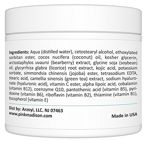 -. Binding : Health and Beauty -. Brand : Pink Madison -. EAN : 0641427816869 -. Feature : SKIN LIGHTENING CREAM with natural ingredients for the youthful beautiful even skin tone / TOP OF THE LINE INGREDIENTS Custom developed using the most effective, safe, and skin healthy ingredients like Bearberry Licorice Kojic Acid Vitamin C & Hyaluronic Acid / PERFECT for use with Pink Madison Whitening Mask / SOPHISTICATED RESEARCH & DEVELOPMENT The cream was custom developed by our team of expert dermatologists and brought to market in 2016. / WOMEN OWNED Pink Madison is a women owned boutique American company that confidently stands behind each and every product. -. IsAdultProduct : 0 -. MPN : 5565733 -. PackageQuantity : 1 -. PartNumber : 5565733 -. ProductGroup : Beauty -. ProductTypeName : BEAUTY -. Title : Pink Madison® Skin Lightening Cream with Kojic Acid Vitamin C Hyaluronic Acid. Natural Brightening Lotion for Melasma, Hyperpigmentation and Dark Skin Age Spots -. UPC : 641427816869