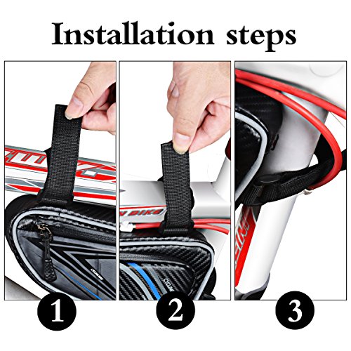 The way you install the bicyle phone pouch is by using 3 velcros on the side so simply attached to the frame. When you install it, the top 2 velcros are going to be fixed on the top The third one is going to go to the stem of your bike, to make sure you have proper placment in order to get the stem velcro around. Once your bike frame bag is secure you'll notice that the cool thing is that the bike bag is at your hand side. The purpose is that you can still enjoy your music from the cell phone while make a riding Package Included:
