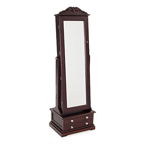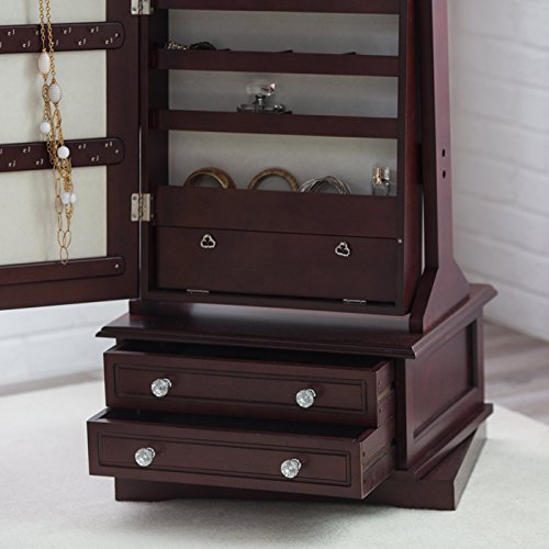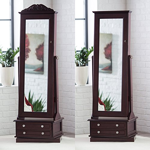 Binding : Kitchen Product Description The Espresso Swivel Cheval Jewelry Armoire stores your diamond rings, pearl earrings, and all sorts of other pretty things. Loaded with storage, it offers quick selection and easy access to your jewelry and accessories. Open the full-length mirror to reveal numerous jewelry hooks, ring holders, earring racks, pocket shelves, bracelet rods, and watch pillows, all protected by soft cream felt. Find even more storage in the two bottom drawers, accented by elegant faux crystal knobs. There's also a lock and key for added security. The adjustable mirror tilts and easily locks in place using the knob on the side. For added convenience, the base of the armoire swivels, so it's easy to get the best view no matter where you stand. Made of durable MDF wood (a dense type of engineered wood that resists warping) and solid wood veneers for lasting beauty, this spacious jewelry armoire has a warm espresso finish and clean, simple lines to go with any decor. 0