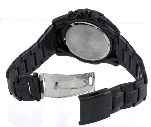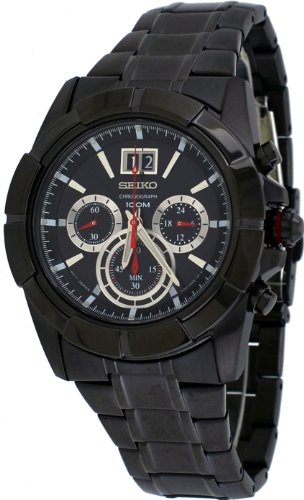 Black ion-plated stainless steel case and bracelet. Fixed black ion-plated bezel. Black dial with luminous hands and index hour markers. Minute markers around the outer rim. Dial Type: Analog. Luminescent hands and markers. Date display at the 12 o'clock position. Chronograph - three sub-dials displaying: 60 second, 60 minute and 24 hour. Quartz movement. Scratch resistant Hardlex crystal. Solid case back. Case diameter: 46 mm. Case thickness: 12.5 mm. Round case shape. Band width: 26 mm. Fold over deployment clasp. Water resistant at 100 meters / 330 feet. Functions: chronograph, date, hour, minute, second. Casual watch style. Seiko Chronograph Black Dial Black Ion-plated Mens Watch SPC103.Feature