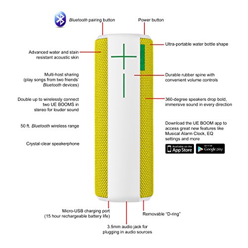 -. Binding : Personal Computers -. Brand : UE -. Color : Citrus -. EAN : 0097855108982 -. Feature : Make Some Noise: UE BOOM is the 360-degree speaker that drops bold, immersive sound in every direction / Up for Anything: UE BOOM has a versatile, go anywhere shape that is designed to be spontaneous / Life-Resistant: Colorful acoustic skin with plasma coating makes UE BOOM water and stain resistant (color tone might vary ) / Live Wirelessly: Switch songs, adjust volume and take phone calls from up to 50 feet away. Easy pairing via NFC for NFC-enabled devices / Double Up: Wirelessly connect two UE BOOMs together in stereo via the UE BOOM app to spread the sound and pump up the volume / The rechargeable battery has 15 hours of playback. Lithium Batteries are included, they are built into the device and are non-removable -. IsAutographed : 0 -. Label : Logitech -. Manufacturer : Logitech -. Model : 984-000449 -. MPN : 984-000449 -. PackageQuantity : 1 -. PartNumber : 984-000449 -. ProductGroup : Personal Computer -. ProductTypeName : COMPUTER_SPEAKER -. ProductTypeSubcategory : 14700425 -. Publisher : Logitech -. ReleaseDate : 2014-10-01 -. Studio : Logitech -. Title : UE BOOM Wireless Bluetooth Speaker - Citrus -. UPC : 097855108982