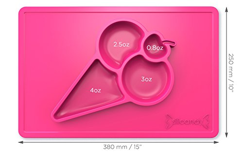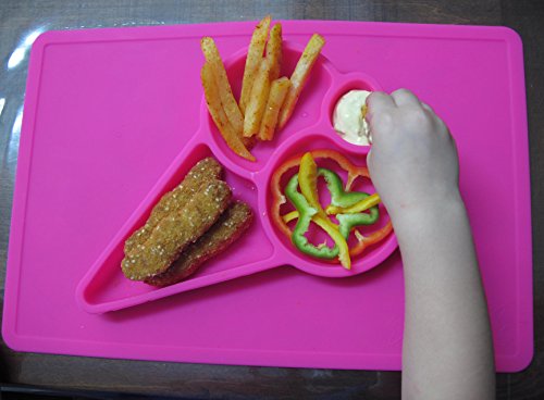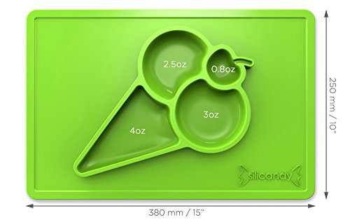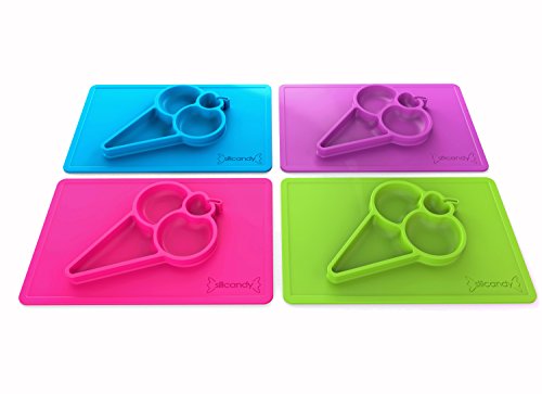 -. Binding : Baby Product -. Brand : Silicandy -. Feature : 100% FDA Approved professional food grade silicone BPA Free and odor free / Dishwasher safe and temperature resistant from -40*- 450* / Bottom on the mat polished and shined to assure it sticks to the table for mess free meals. / Adorable way to enjoy serving your child's meals and a fun way for them to eat! / Ice cream sundae shape includes 4 compartments, ideally for vegetables/fruits, a carbohydrate, a protein, and a condiment in the cherry on top, such as ketchup. You may also include a square of chocolate instead of the condiment for an end of meal reward/dessert. -. Label : Silicandy -. Manufacturer : Silicandy -. MPN : SilicandyIceCream1 -. PackageQuantity : 1 -. PartNumber : SilicandyIceCream1 -. ProductGroup : Baby Product -. ProductTypeName : BABY_PRODUCT -. Publisher : Silicandy -. Studio : Silicandy -. Title : Silicandy Silicone Placemat One Piece Divided Multiple Compartment Ice Cream Sundae Theme for Mess Free Eating