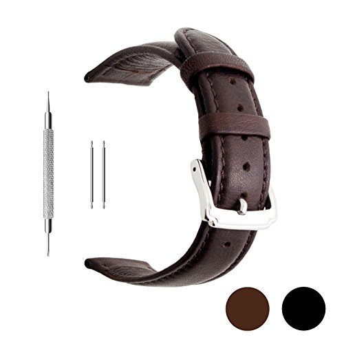 -. Feature : QUALITY: Extra soft high quality genuine calf leather watch band with solid stainless steel buckle. Premium and comfortable. Both the front and back sides are made of calf leather. / WIDTH SELECTION: Suitable for both traditional and smart watches with 18mm, 20mm, 22mm lugs. Please measure your watch lug width or width of current band at connection point before order. You can also find the width online at the manufacturer's or watch retailer's web site. 2 spring bars and 1 spring bar tool are included. It is easy to remove and fit spring bars. / WRIST FIT: It is regular length, fit wrists approximately 6.75" to 7.75" in circumference, but watch geometry also impacts fit. Band length--125mm long/75mm short (buckle not included). / SMART WATCHES WITH 20MM WIDTH: Moto360 2nd Gen Men's 42mm, Samsung Gear S2 Classic, Pebble Round Large, Fossil Q Gazer, Pebble Time Round Large, Withings Steel HR 40mm, TICHWATCH 2. You can find more smart watch width in "Product Description" section. / If your watch lug width is 19mm, 21mm, or 23mm, you can buy the next size up. The leather is pliable enough that you will be able to squeeze the larger strap between the lugs of your watch, for a fit that won't leave a gap between the lugs. But you should use your original spring bars.