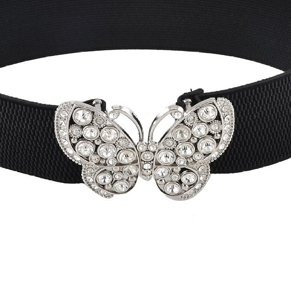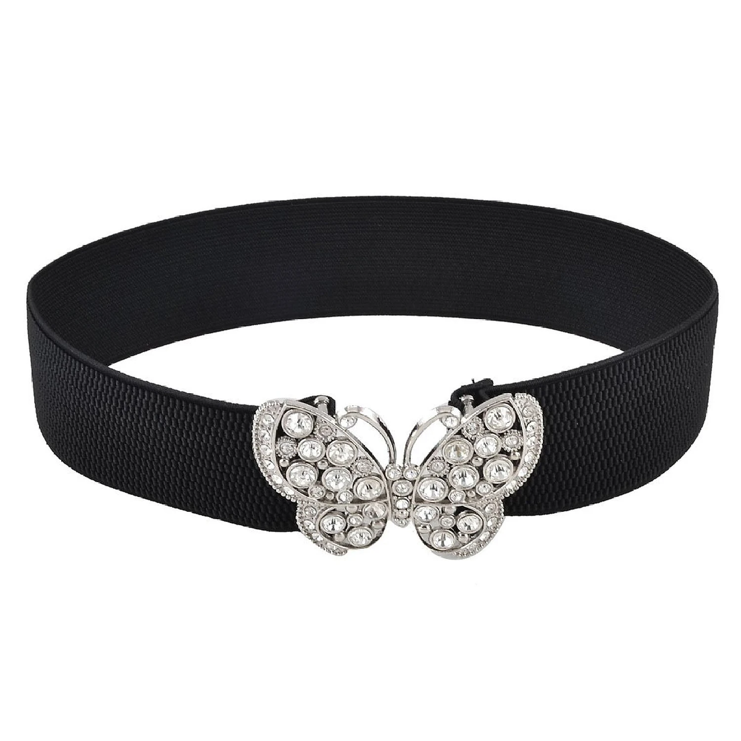 Net Weight : 56g;Package Content : 1 x Lady Waist Belt Glittery rhinestones decor butterfly design metal Hook buckle, textured elastic band, cinch belt.