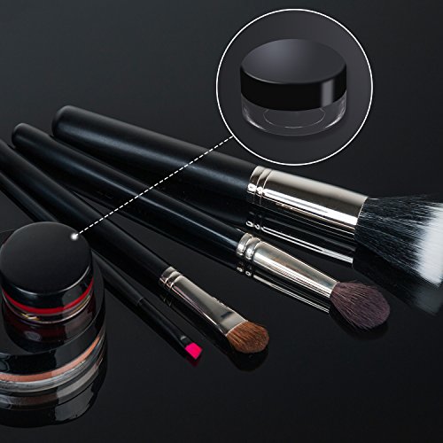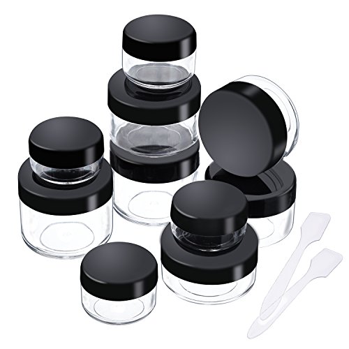 eBoot 10 Pieces Empty Clear Plastic Sample Containers 3/ 5/ 10/ 15/ 20 Gram Size Round Cosmetic Pot Jars with Screw Cap Lids and 2 Pieces Mini Spatula (Black)
