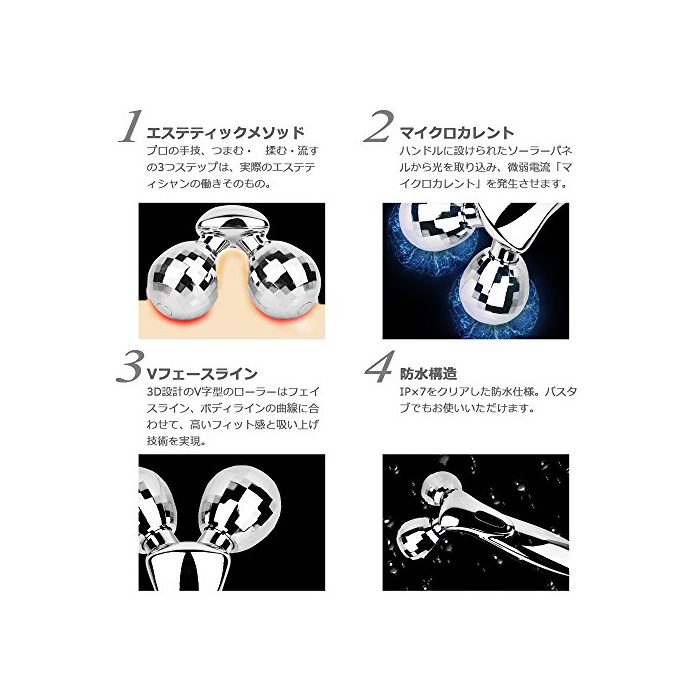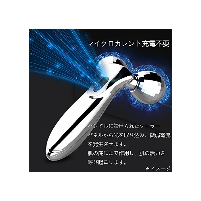 【미전류 식미안기】손잡이에 마련된 커다란 솔라 패널로부터 빛을 받아 들이고, 미약 전류를 발생시켜 충전 불요.거기에(게다가),혈행의 촉진,리프트 업에 최고이다.부어 오르고, 해리,주름의 소거에 효과도 있습니다!
