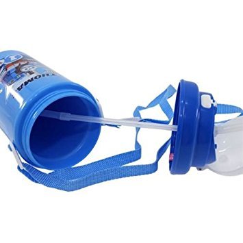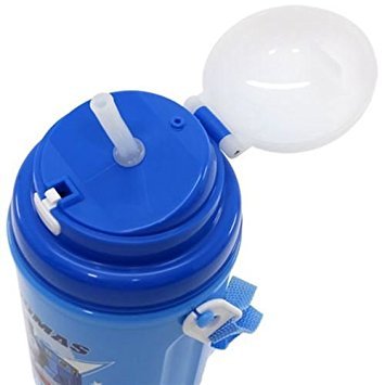 Easy carrying strap, soft end on straw makes it possible to drink all the liquid, wide opening makes washing easy, push button to open lid, side groove makes it easy for children to hold