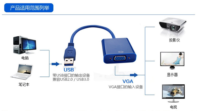 【产品用途】USB转VGA通过笔记本、台式电脑等带USB接口的设备转成VGA后可以