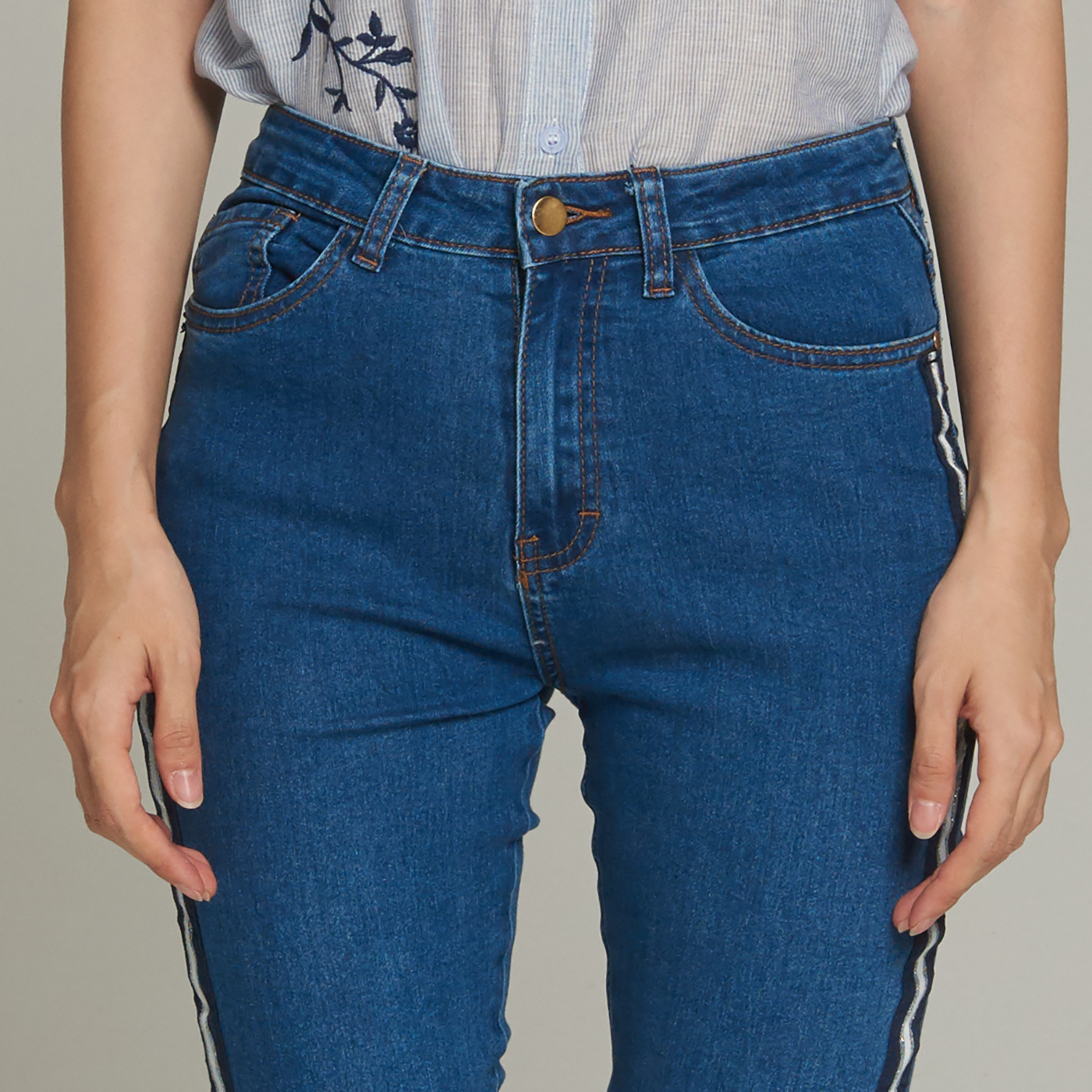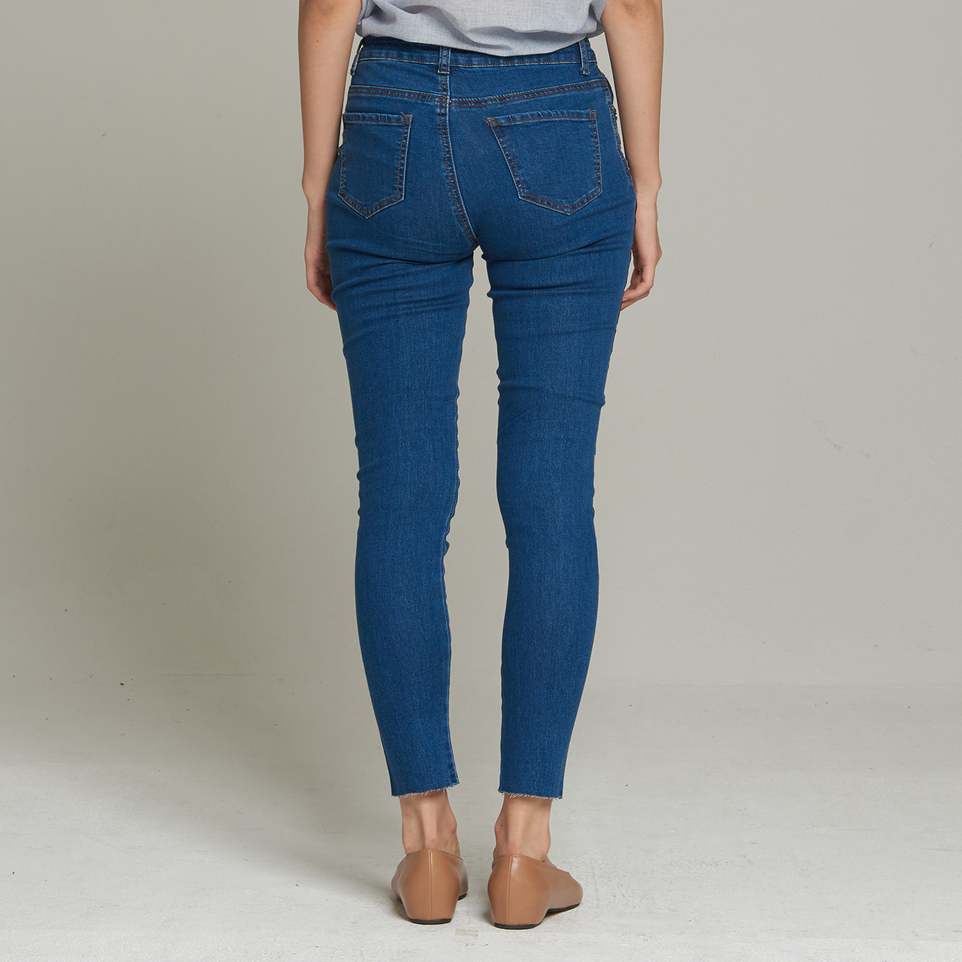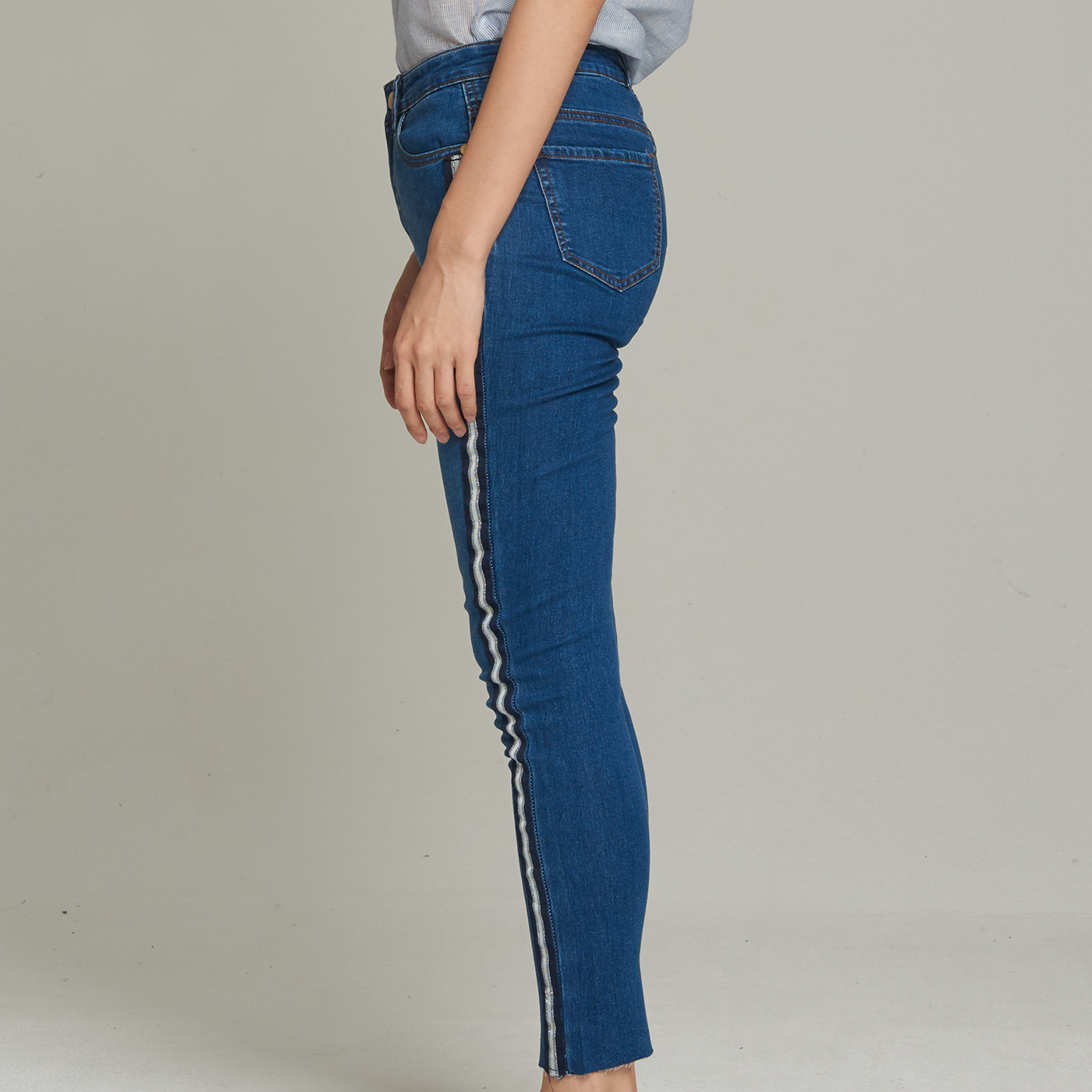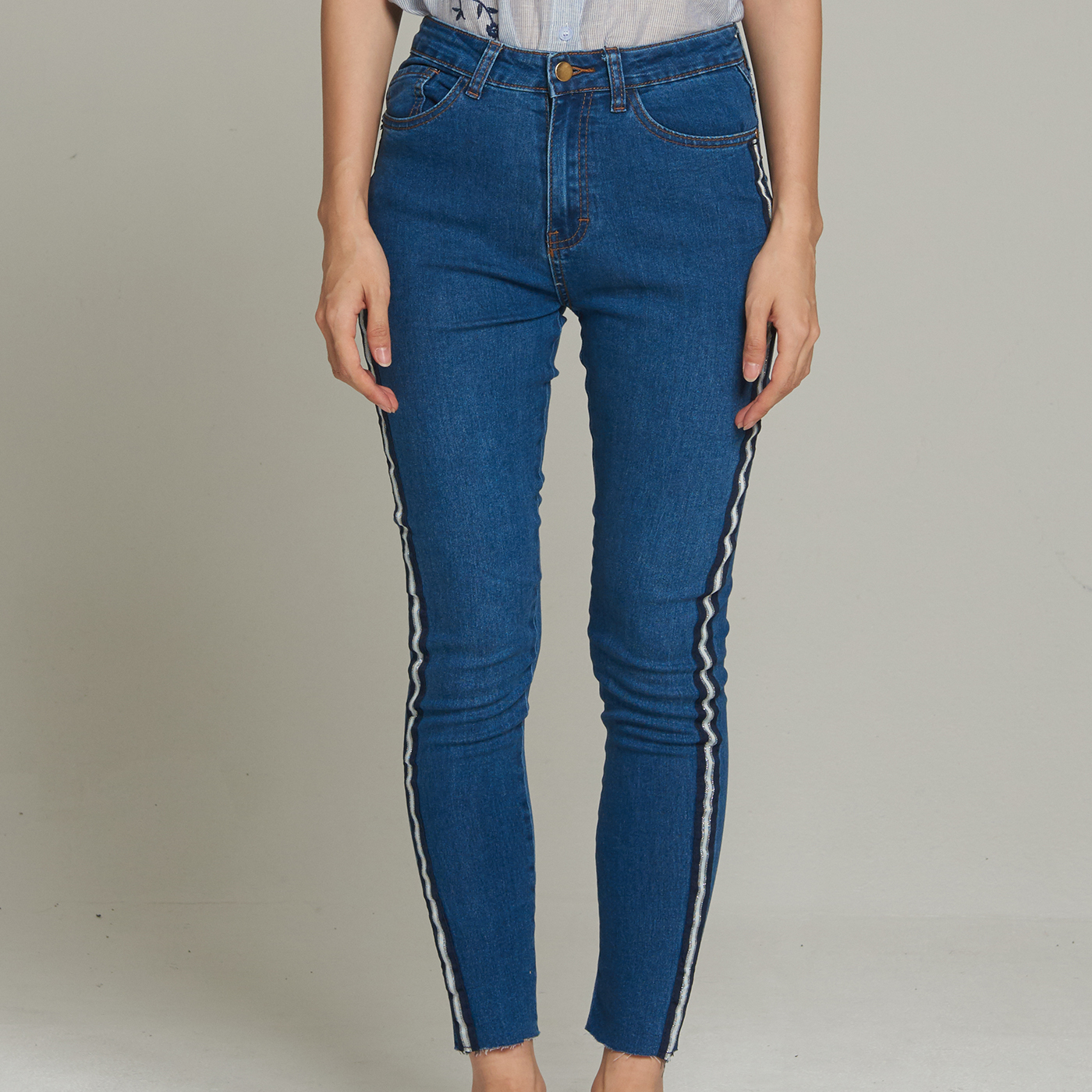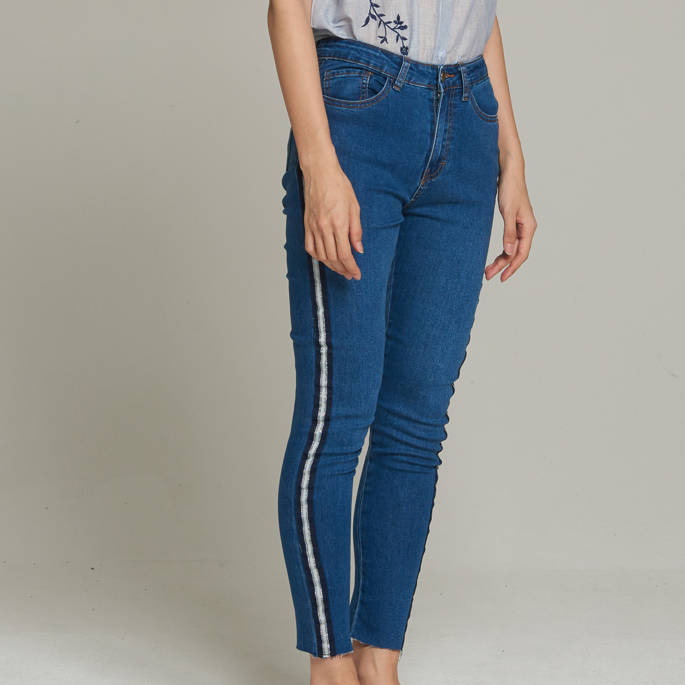 사이드 테입 스키니 팬츠로 신축성이 있어 편하고 시크한 스타일입니다.