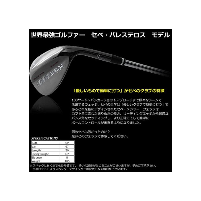 SEVE MAJOR WEDGE 《세베메쟈》 웨지(wedge) 52 《세베바레스테로스》 모델 《세베메쟈》 웨지(wedge)는 로프트각에 따른 흔들어내의 좋은 점,리딩 엣지부터 최적인 advanced각을 셋팅 하고, 보다 정확에 그리고 간단하게 볼 콘트롤을 할 수 있게 되었습니다.어드레스에 스퀘어《―》인 필링을 빚는 바와 같이(하도록),리딩 엣지로 개선을 더하였습니다.로프트각:52°고, 라이각:67°고, 길이:36인치,advanced각:8°고, 총중량:485g
