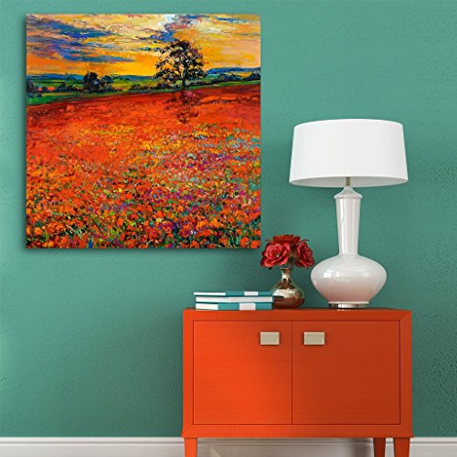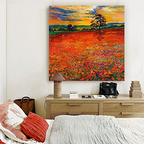 Original Design. Nothing like the prints you could find in the market. The red poppies flourish on the ground. The golden sunset covers the flowers and trees. These form a beautiful scenery. Bring it to your bedroom. When wake up from dream of time, open eyes to see a full mountain time red. Brings you a good start.