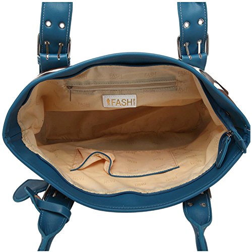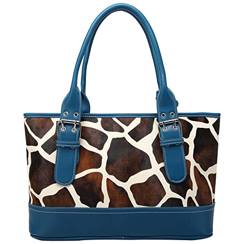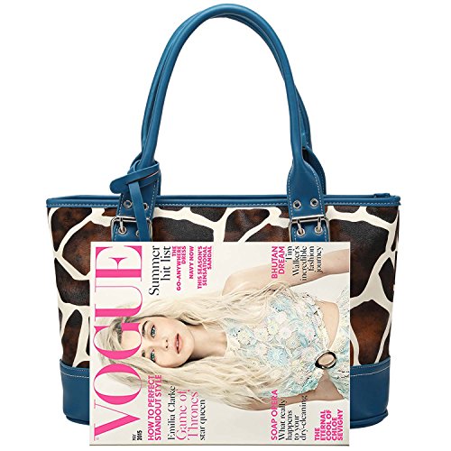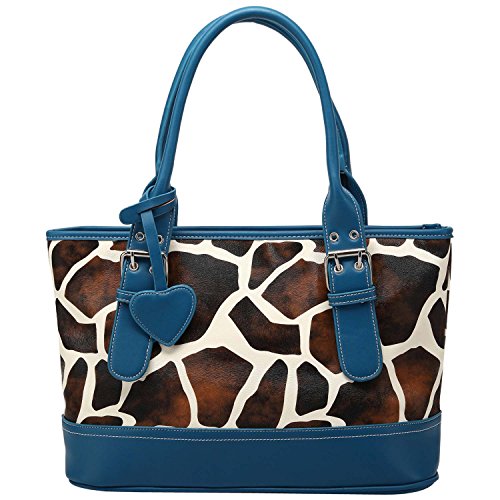 -. Feature : Material: High Quality Giraffe P.R.Int Man-made Leather / Dual Adjustable Handles with Silver-Tone Hardware and faux leather heart shaped charm / Top Zippered Opening with Spacious Compartment / High Quality Fabric Lined Interior with Multiple Interior pockets (1 Zippered and 2 Open) / Approximate Dimensions: Exterior - 14.9" L X 9.8" W X 5.9" H; Handle Drop: 8"