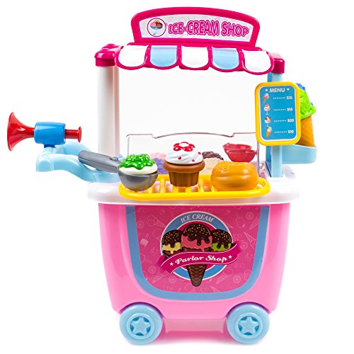 -. Feature : Fantastic items: toysery ice cream toy set consists of various interesting dessert items that fit into a two tier stand placed on a four wheeled cart. / Easy to assemble: it includes different flavored ice cream sticks, lollipops, sandwich, fast food box, box of sweets, bottle of juice etc. / Made of plastic: our ice -cream is safe and no harm to your baby. It also comP.R.Ises of a money bowl, play cash coins and an ice cream bowl with a spoon. / Creative puzzle toy: ice-cream shop creative puzzle toy for your kids to play, improve children cognition, intelligence, and exercise their logical thinking. / Age: recommended age 3+ dimensions:7x8x14inches.