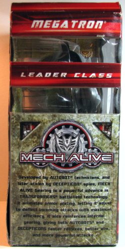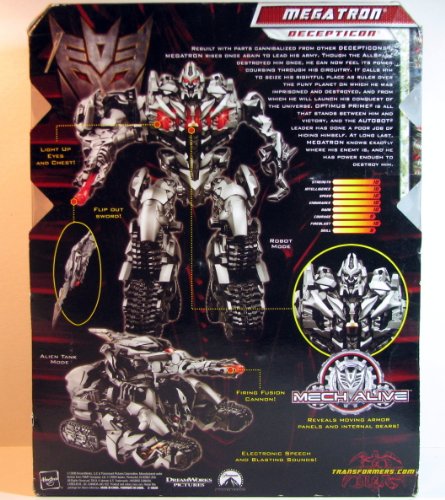 Prepare for an exciting battle with this DECEPTICON leader! In robot mode, this mighty warrior features electronic speech and light-up eyes and chest that give away his diabolical intentions. And with a flip-out sword, this bad guy is ready to give AUTOBOT forces the fight of their lives! In tough alien tank mode, a firing fusion cannon and blasting sounds lets attackers know this villain means business. MECH ALIVE gearing reveals moving armor panels and internal gears so you can recreate some of your favorite movie scenes â or create your own! Grab this fearsome foe and roll out!