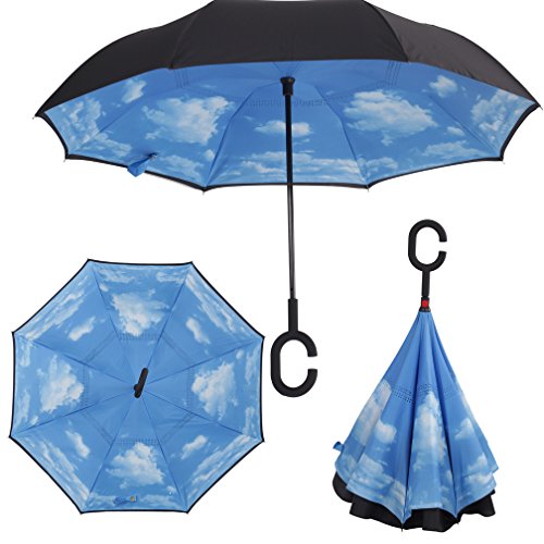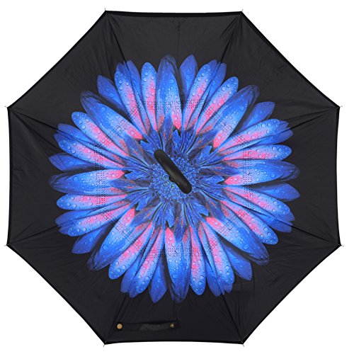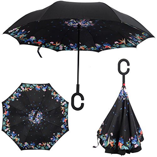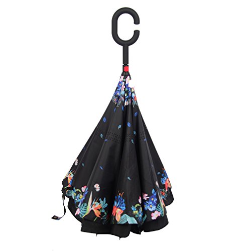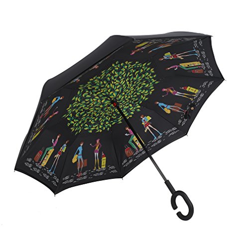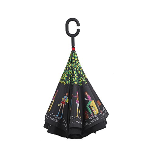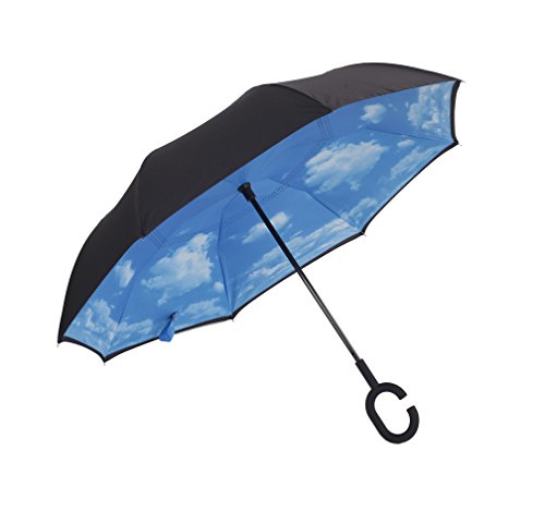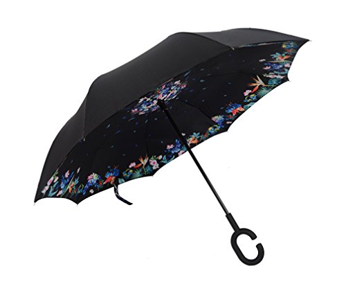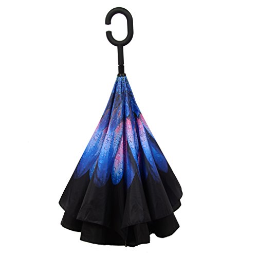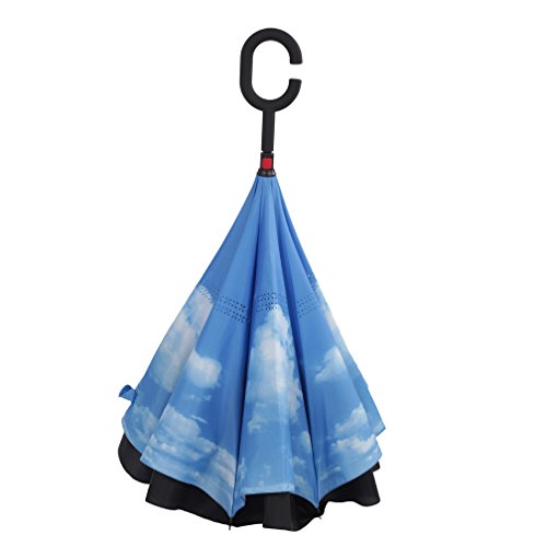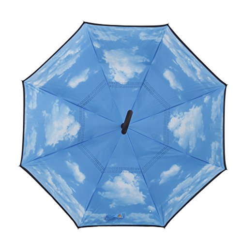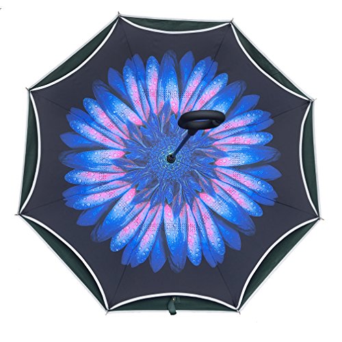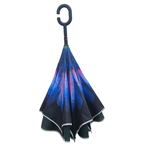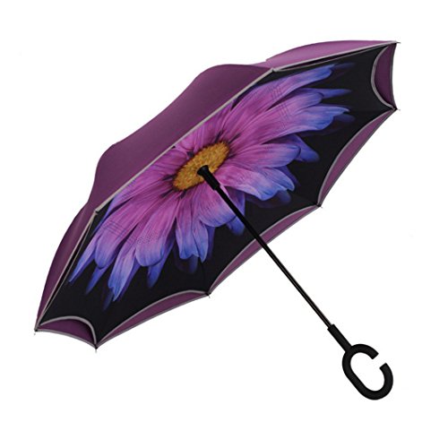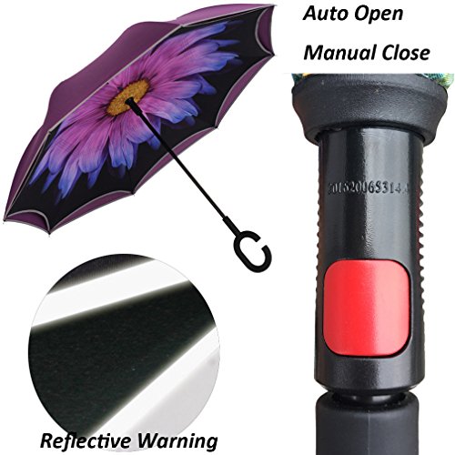 During rainy day,this reversible umbrella will be very helpful to keep your car and document dry. With the revolutionary inverted technology,the wet side is on the inside when closed and the dry side will be on the outside when opened. The C Shape Handle allows you to hook it on your hand to make you hands free to other stuff(such as playing cellphone,carrying baby or carrying shopping bags). With the double layered design,the effect of windproof,waterproof and UV protection is better than the traditional one layered umbrella. Self-Standing: It can stand by itself so you can put it anywhere you want. How to USE: Opening is from inside out and closing is from outside in. Manual Open and closed 0 |