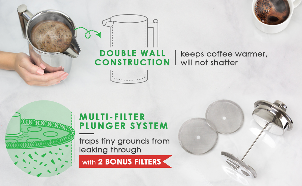 The LINKYO French Press Coffee Maker is made to last with high grade 18/10, 304 stainless steel. The double-wall construction keeps your coffee warmer than glass carafe presses and the best part is...they will not shatter! The multi-screen filter system effectively prevents tiny coffee grounds from leaking through when pressing. The metal filters are reusable, saving you money from disposable paper filters and allowing you to brew delicious coffee over and over again!