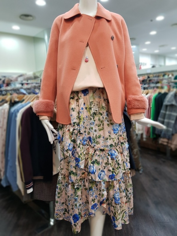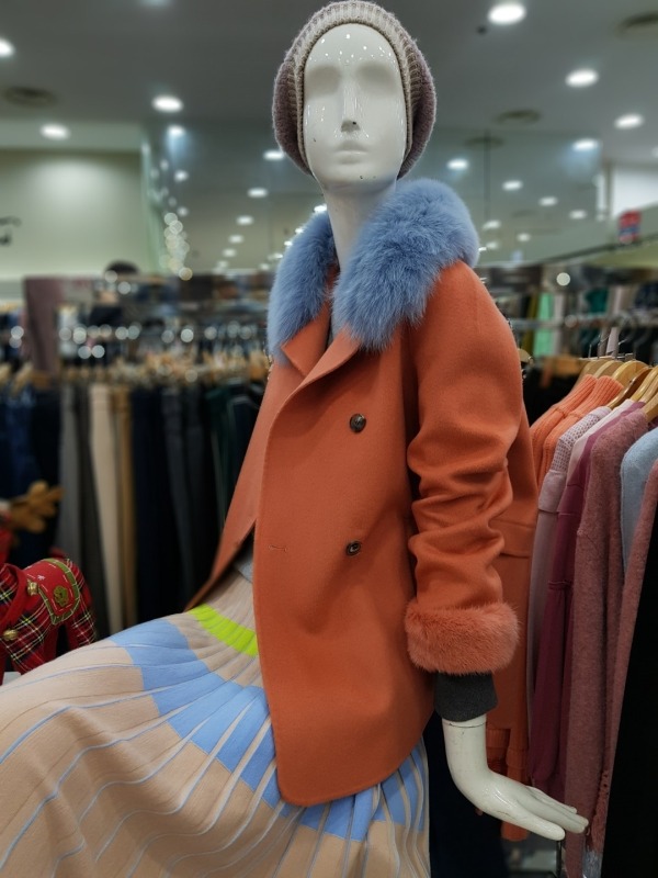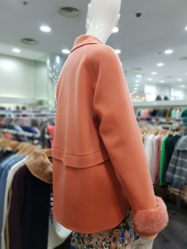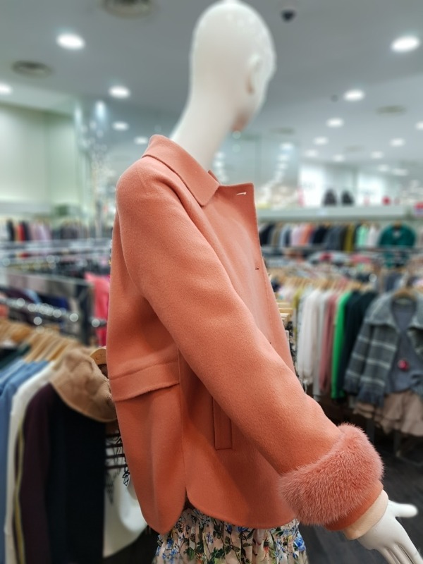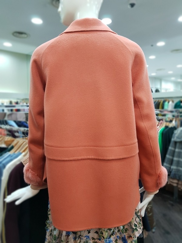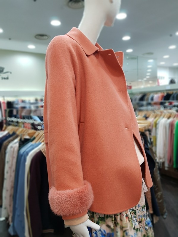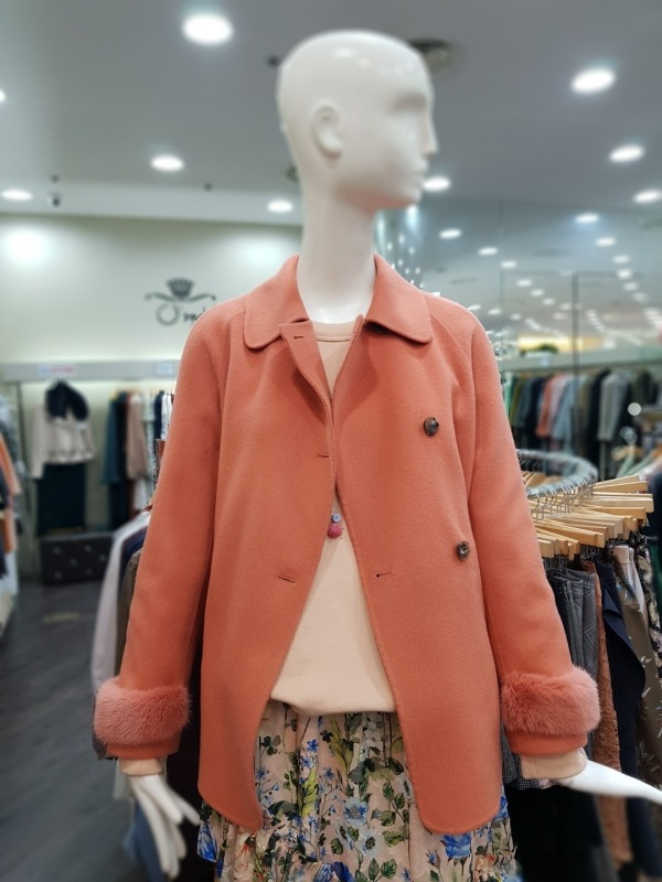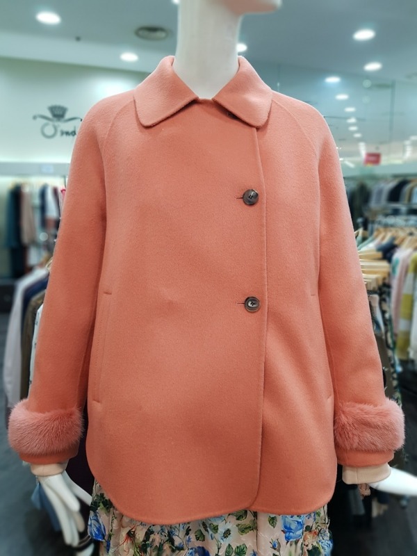 솔리드한 컬러감과 슬리브의 앙고라 퍼 디테일이 포인트로 들어간 하프코트로 러블리하 디자인의 옷입니다.