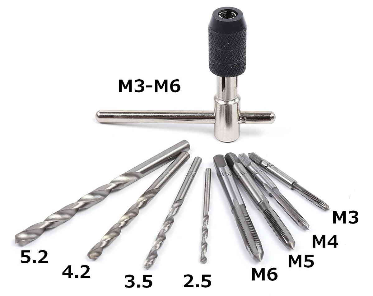 ・サイズ:タップ/M3×0.5、M4×0.7、M5×0.8、M6×1.0 下穴ドリル/2.5mm、3.3mm、4.2mm、5.0mm T型ハンドル/M3-M6 材質:タップ/合金鋼、T型ハンドル/合金鋼、下穴ドリル/高速度鋼 重量:125g