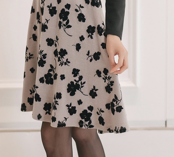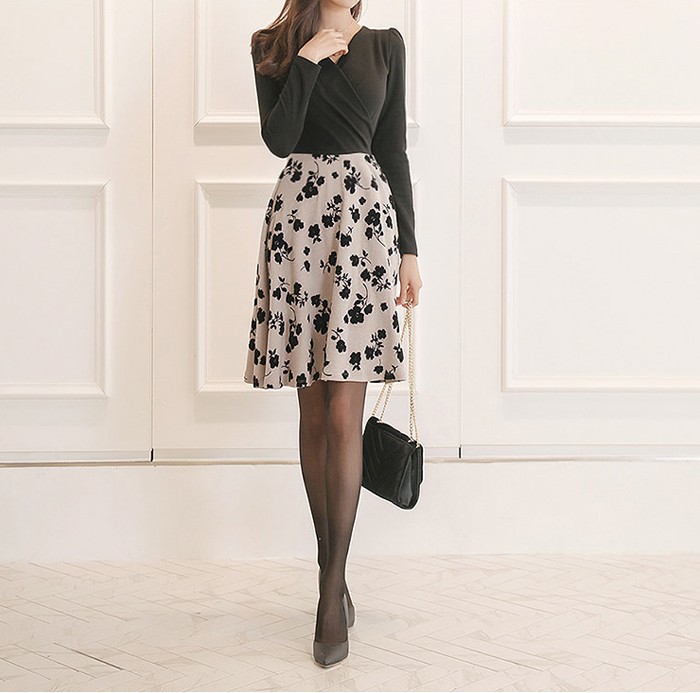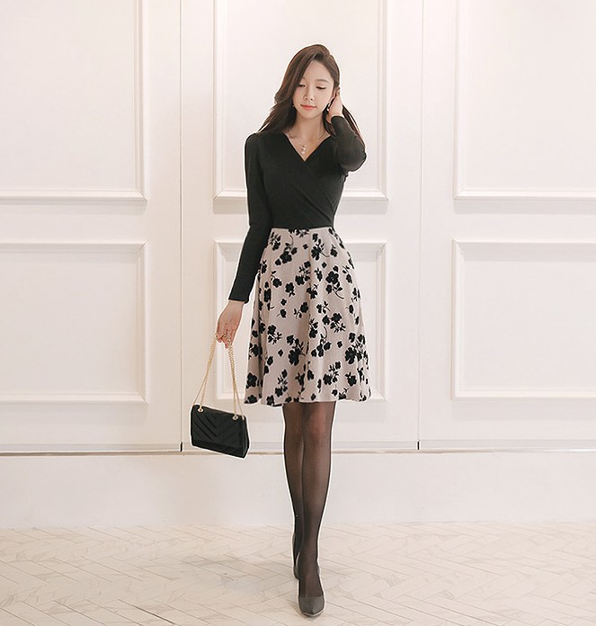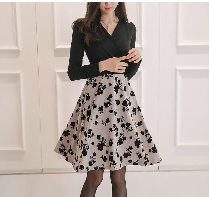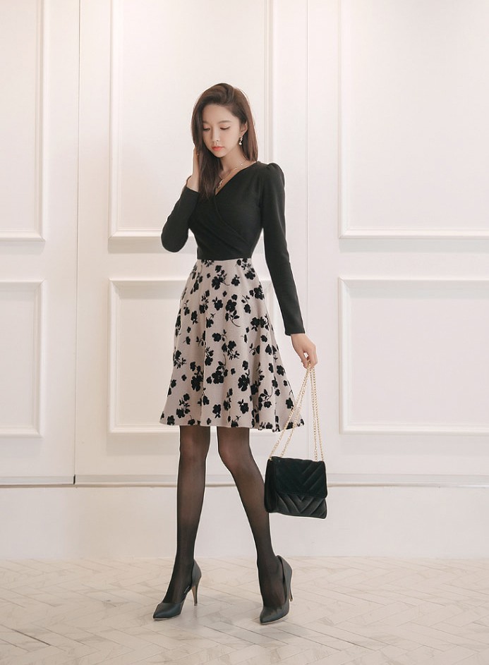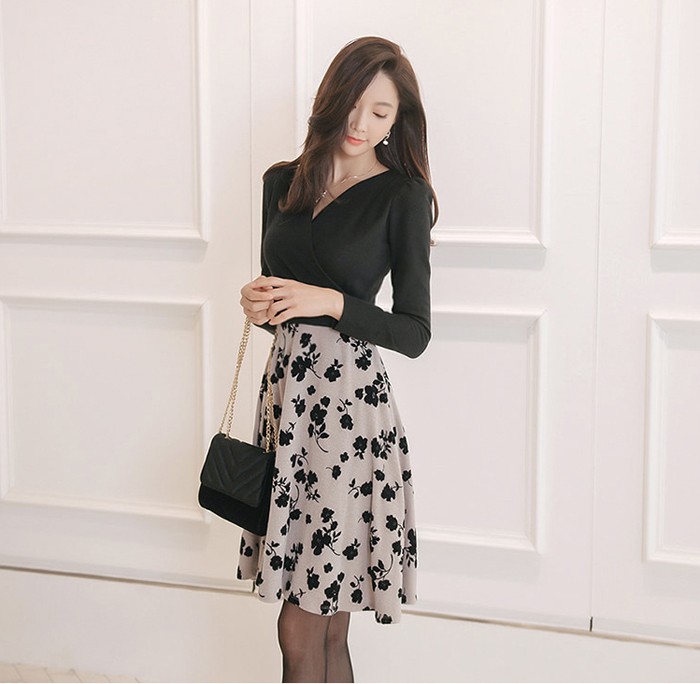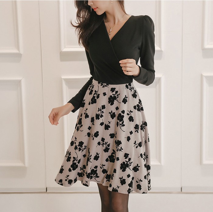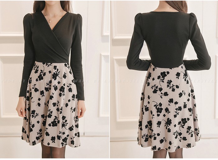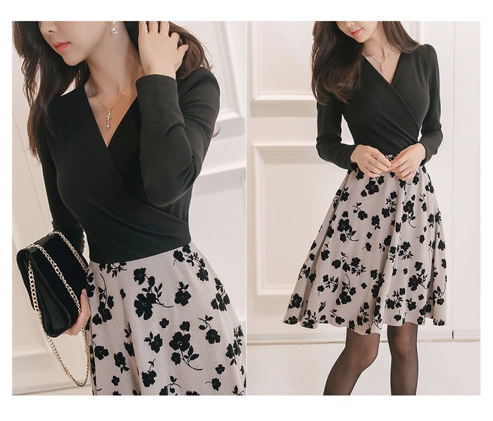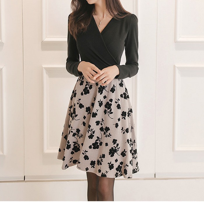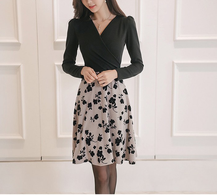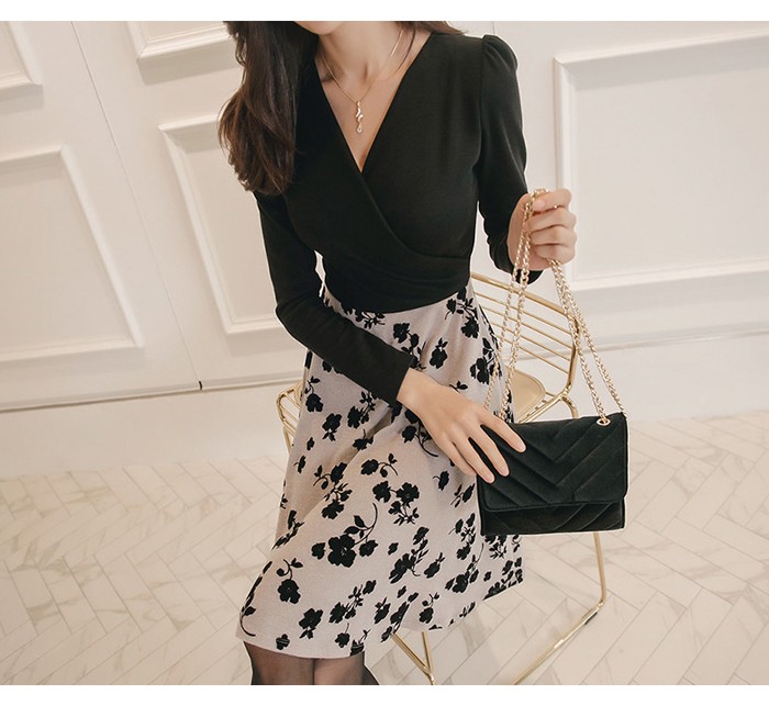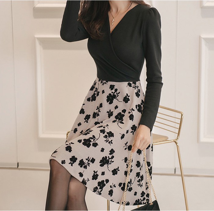 商品名:ワンピース バイカラー 花柄 カシュクール 長袖 ミニ丈