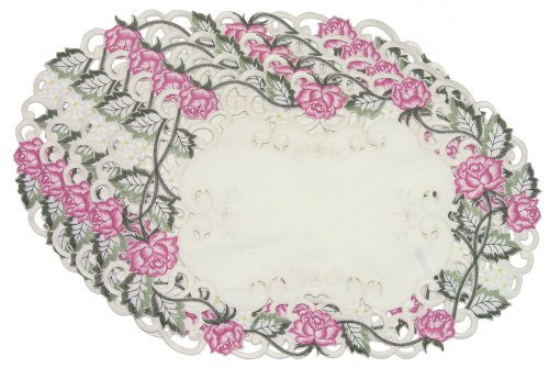-. Feature : Set of 4 elegant fancy embroidered oval placemats / Pink roses with green vines and leaves on a cream ecru background. Perfect table decoration for any time of the year. / Great for dinner parties, house warming gifts, bridal wedding shower gifts and a great addition to any home decor. Give as a gift to any rose or flower lover. / Click on our store name (Relevantgifts) to see the matching accessories including Runner / Approximate size 11"H x17"W, Machine washable, (Gentle Wash)