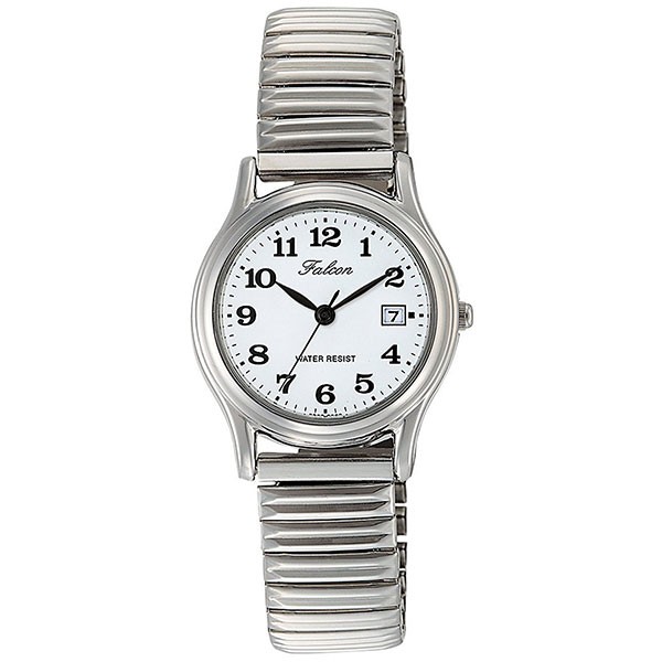 バンドカラー:シルバー、文字盤カラー:ホワイト、ケースの形状:ラウンドフェイス、表示タイプ:アナログ表示、留め金:伸縮性バンド、日付表示、防水:3気圧