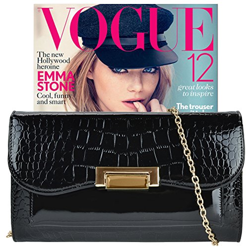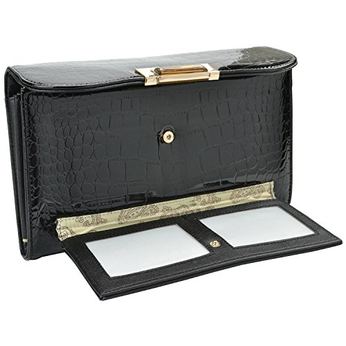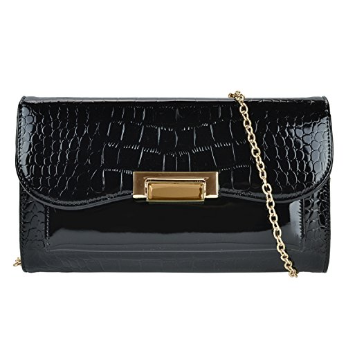 - Feature : Make a statement with the versatile and sleek AJA black glossy alligator style print clutch. / This timeless clutch features 1 zippered interior pocket that divides into two compartments, 3 open pouches to fit makeup (lipstick, lip gloss, mascara), 1 long slot to hold cash and 8 small slots for ID or credit cards. / A removable chain strap allows several wearing options - cross body, over-the-shoulder or in hand. / The exterior boasts gold-toned hardware accented with a large brown faux gemstone on the snap front flap. A smaller front compartment has button snap closure with 2 slots for cards. / **Official MG Collection® product by MyGift®**. Approximate Dimensions: Exterior - 9.8" L x 5.1" H x 1" W. Interior - 9.5" L x 4" H x 1" W. Shoulder strap (fully extended) - 24" drop.