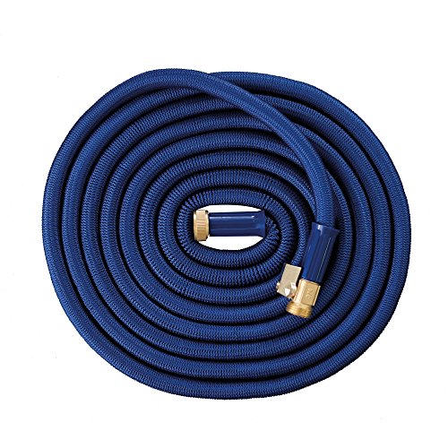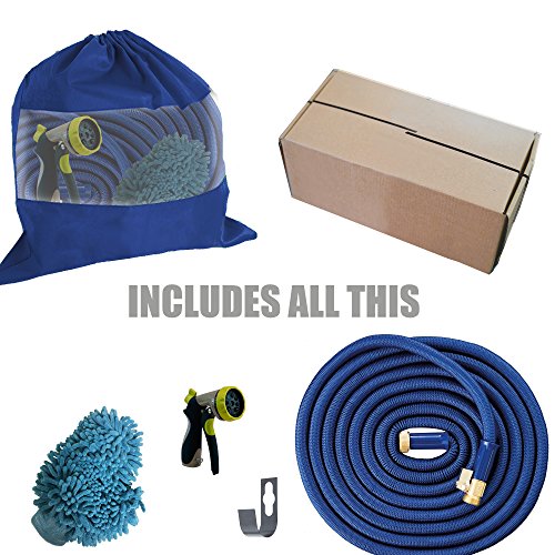 Expandable Hose, Expanding Water Hose Heavy Duty Latex Solid ON/OFF Brass Valve Connector Includes FREE 8 Pattern Nozzle Sprayer - Microfiber Car Wash Mitt - Storage Bag Washers (100 FT, BLUE)