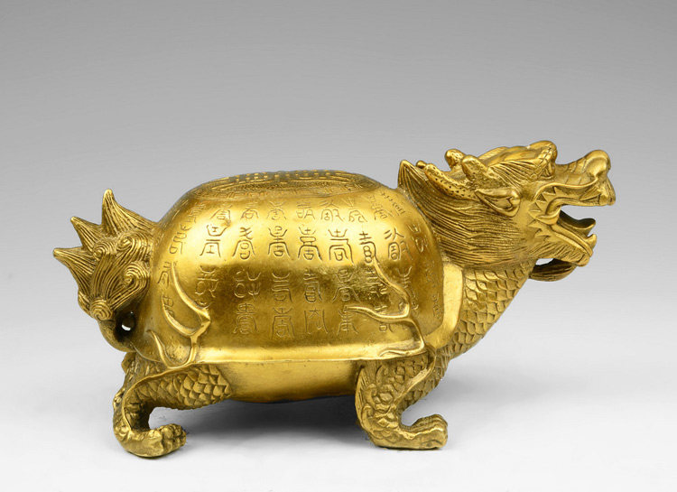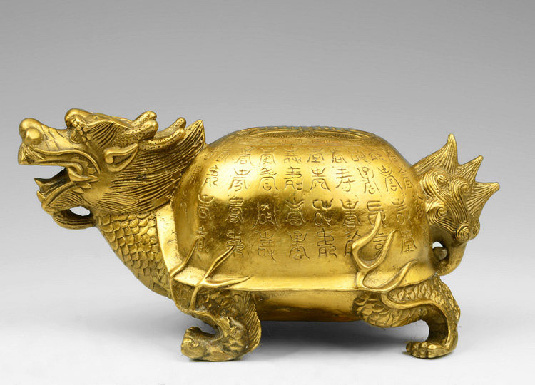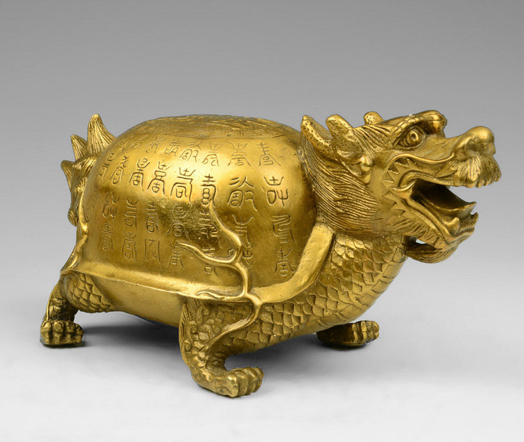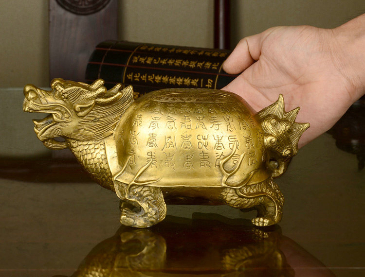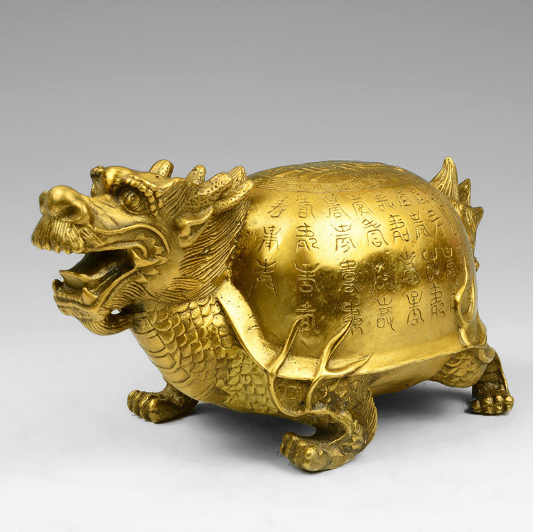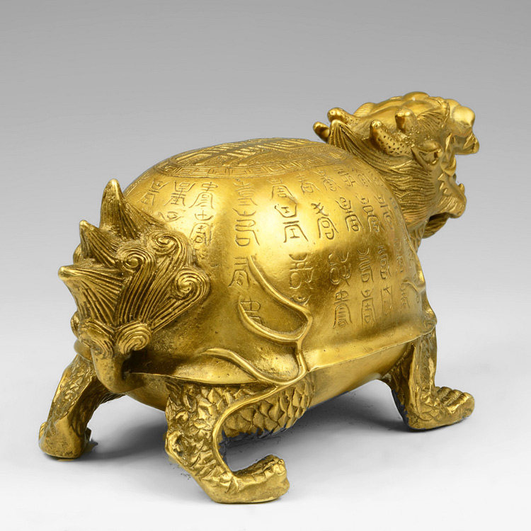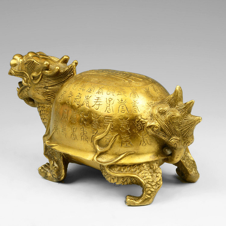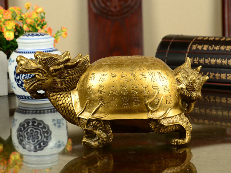 龙龟,瑞兽一种,主吉祥招财,化三煞。龙龟放在财位可催财,放在三煞位或水气较重之地最有效,风水学有云:“要快发,斗三煞”。水气重之风水位主是非口舌,龙龟在位能化口舌兼加强人缘。龙龟有忍耐、负重、长寿、权威的象征,在众多吉祥之物中,此兽是最为祥瑞之一者。相传为古代神龙所生之子,背负河图洛书,揭显天地之数,物物一太极,上通天文,下知地理,中和人世;龟背、龟尾有制煞解厄之效,龙头有赐福之意。