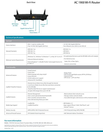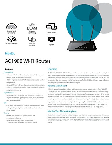 -. Binding : Personal Computers -. Brand : D-Link -. EAN : 0898029669007 -. Feature : Advanced AC1900 Wi-Fi Dual-Band (600N+1300AC Mbps Speed) performance / Lag free streaming using fast and reliable wireless, ethernet and USB performance / Advanced wireless AC beamforming dramatically enhances wireless signal strength and throughput / Gigabit WAN and LAN ports for high-speed wired connections / Two USB ports to connect storage drives and printers for sharing / Advanced Quality of Service (QoS) / Smart Connect Technology will efficiently select the fastest Wi-Fi for every device -. Format : CD-ROM -. IsAutographed : 0 -. IsEligibleForTradeIn : 1 -. IsMemorabilia : 0 -. Label : D-Link -. LegalDisclaimer : Item is being sold as is, in the condition listed. -. Manufacturer : D-Link -. Model : DIR-880L -. MPN : DIR-880L -. OperatingSystem : Windows 7, Mac OS -. PackageQuantity : 1 -. PartNumber : DIR-880L -. ProductGroup : Personal Computer -. ProductTypeName : NETWORKING_DEVICE -. Publisher : D-Link -. Studio : D-Link -. Title : D-Link Wireless AC1900 Dual Band WiFi Gigabit Router (DIR-880L) -. UPC : 790069404474 -. Warranty : Comes with Manufacturer Warranty.