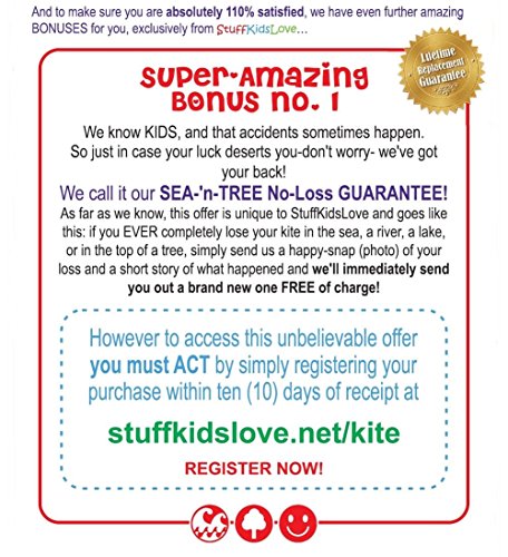 -. Feature : NEVER BUY A TERRIBLE KITE AGAIN! Top Quality, hi-tech materials are used throughout. Unlike others, our kite is tough, strong, light, flexible, rust-proof, and mold-proof. Hand-made by the World's Best kite factory, it will last forever ... KIDS JUST CAN'T BREAK IT!! / Ships from USA and EVERYTHING INCLUDED: Single-line Delta Kite measuring 60" (150cm) Wide x 32" (80cm) Long with 8.5ft (2.6m) Twin Tails, single 200ft (60m) anti-tangle Flying Line on Handle, Assembly and How-To-Fly Instructions, Spare Parts Kit, Durable Storage Bag with Carry Handle. / UNSURPASSED FLYING PERFORMANCE: Fully tested "By Kids For Kids", easy to fly, and perfectly balanced, our kite's vivid colors and sleek styling looks fantastic, and it virtually flies itself in almost any conditions! / Oh-so SIMPLE and VERY EASY: Comes partially pre-assembled and INCLUDES easy-to-follow ASSEMBLY instructions. And thanks to our kid-friendly tail and line clips, they'll be flying like a pro in no time! Oh, and did we mention that it's unbreakable...?? / MAKES THE PERFECT GIFT: Includes exclusive BONUSES you'll love, like FREE replacement upon loss with our exclusive Sea-'n'-Tree "No-Loss" Guarantee! Get ready to take off for an amazing kite flying experience...