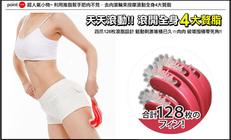 臀按摩滚轮,整体爪子造形,符合臀部曲线,随著每个部位的弧度适当调整按摩。凹凸颗粒设计,搭配每个轮子由32片组成的按摩滚轮,将每个部位紧密服贴按摩。