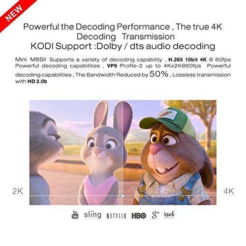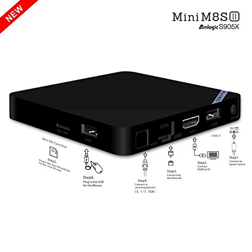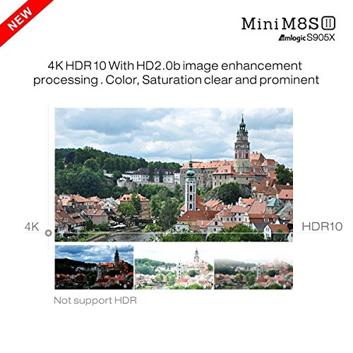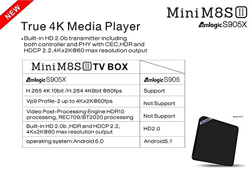 -. Feature : Amlogic S905X is coming! MINI M8S II TV BOX come with the newest CPU-Amlogic S905X,which run faster than Amlogic S905 and supports HDR10 and HLG HDR processing. MINI M8S II TV BOX utilizes the latest version eMMC memory which users can enjoy faster read & write speed and make the TV BOX run more stable and smoothly. For more advantage about Amlogic S905X, please look at the No.7 image on the lfet / Google Android 6.0 Lollipop OS, the newest generation of multimedia player. Preconfigured with the latest XBMC/KODI 16.1 , hundreds of free streaming add-ons available. SAVE your money for paying cable, satellite or whatsoever. / Cut your monthly TV subscription and enjoy FREE Movies, shows and live entertainment from all over the world including sports. No restrictions! Forget the limitations and necessary payments by using Apple TV or ROKU! You also can play thousands of android games in a large screen smoothly. Install your favorite apps and enjoy advanced technology. / The CPU is Amlogic S905X Quad Core ARM Cortex-A53 CPU up to 2GHz(DVFS), is way ahead in image processing and computing. Its high machine configuration and 2GB RAM AND eMMC Flash 16GB ROM gives you ultra-fast running speed and professional image processing ability. With the built-in HD 2.0b transmitter and supports HDR10 and HLG HDR processing, make sure you can enjoy any 4Kx2K movies.