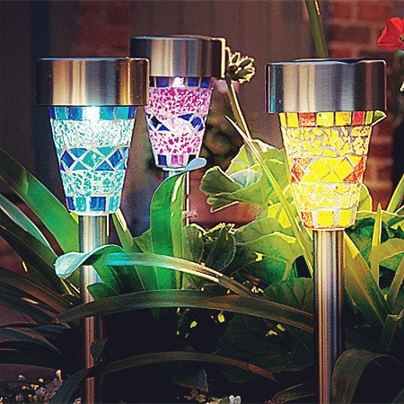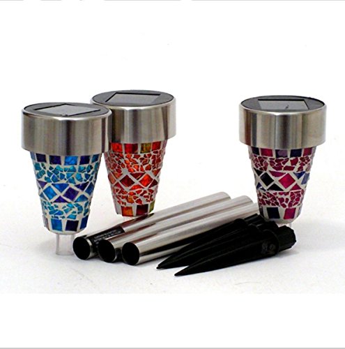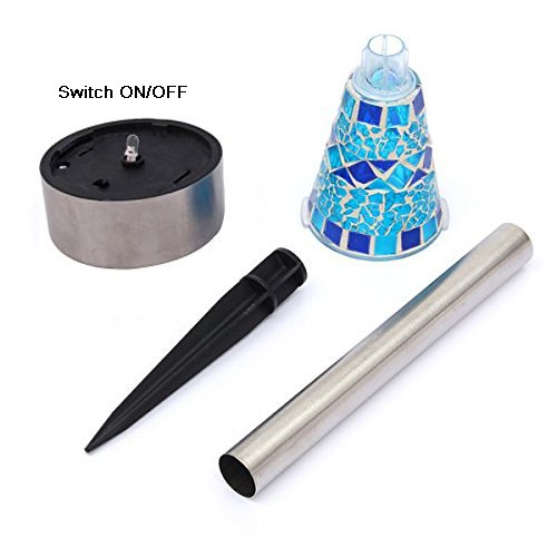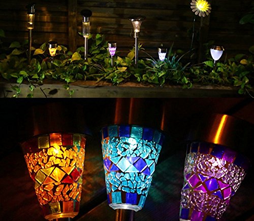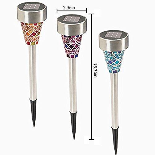 - Stainless Steel Material: Each solar lamp and pole is made of high quality stainless steel and each lampshade is made of bright colored glass pieces. Waterproof design. The Mosaic Decoration Stake Lights will have a superior charming performance, perfect in your garden, front lawn, flowerbed, pathway, walkway, driveway