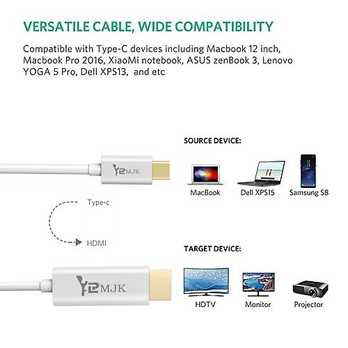 No Adapter, No Converter YRMJK USB C to HDMI Cable lets you use the USB-C port on your computer to directly deliver visuals on your HDMI-equipped monitor/HDTV/projector without the need for cumbersome adapters. Resolutions up to 4K 60Hz Support resolutions up to 4K with a refresh rate of up to 60Hz for a clear picture that reduces blurring during fast-action scenes. Plug and Play Plug and play design, no external power and driver required with this cable. Supports bus-powered and self-powered operation. OS Compatibility Compatible with Windows OS XP/Vista/7/8/10 (X86/X64), Mac OS 10~10.12.1. USB Type C Compatible Devices: - 2017 MacBook Pro - 2016 MacBook Pro - 2015/2016 MacBook - ChromeBook Pixel - Dell XPS 13-9350-R1609 13.3", XPS 15 - Acer V15 Nitro - Asus GA-Z170X - HP EliteBook Folio G1 - Asus ZenBook UX390UAK - Lenovo Yoga 910 - HuaWei MateBook - Samsung Notebook 9 900X5L-K01 - Samsung Galaxy S8 or S8 Plus - LG 34" Class UltraWide Gaming Monitor etc. Important Notes: 1.It works for Thunderbolt 3 compatible Type-C port only. 2.It is only compatible with computers with DP alt mode, not for USB-C smartphones and tablets, as most of them work with MHL or SlimPort solution. 3.It needs 8-10 seconds for the signal to synchronize from computer with your monitor. 4.DO NOT used with another adapter 5.4K resolution requires a 4K equipped source, and 4K display. For instance, if your computer supports 4K 60Hz, while your monitor/TV only supports 4K 30Hz or 1080p, you can only output 4K 30Hz or 1080p rather than 4K 60Hz. MacBook 12" Adoes not support 4K 60Hz output; it has a maximum output of 4K 30Hz. 6.Make sure your Notebook is Thunderbolt 3 USB 3.1 compatible or this wont work for you 0 |