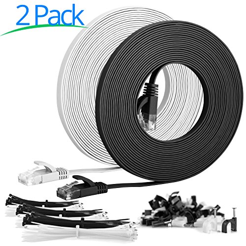 Cat6 Flat Ethernet Patch Cable - 15 Feet - 2 Pack - High Speed Internet Lan Cable with Snagless RJ45 Connectors For Fast Computer Networking + Cable Clips - Cable Ties - Multi Color