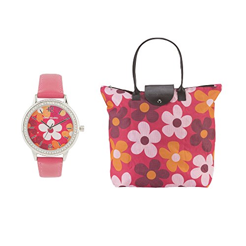 Women's Faux Leather Strap Watch with Simulated Diamonds & Foldable Multipurpose Bag by GINO MILANO- (Pink)