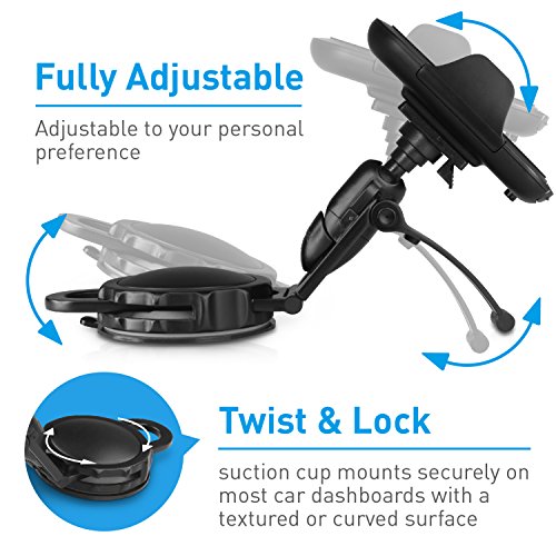 The twist-and-lock suction cup mounts securely on textured and / or curved surfaces of car dashboards and able to withstand extreme temperatures